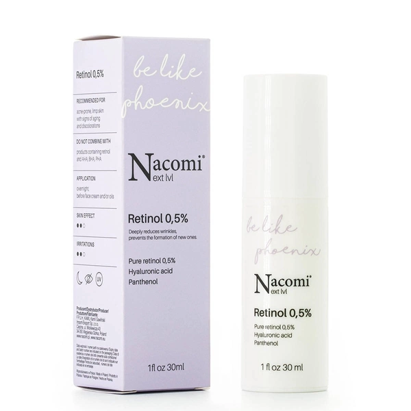 Nacomi Next Lvl Serum z Retinolem 0,5% dedykowany dla cery dojrzałej, z problemami skórnymi, tłustej i z przebarwieniami. Wspomaga w redukcji wydzielania sebum, doskonale wygładza skórę, długotrwale nawilża jak i łagodzi stany zapalne. Składniki aktywne takie jak retinol, gliceryna, panthenol sprawiają że zmarszczki stają się płytsze, przyspieszają regenerację naskórka jak i ochrania przed negatywnym działaniem czynników zewnętrznych.
