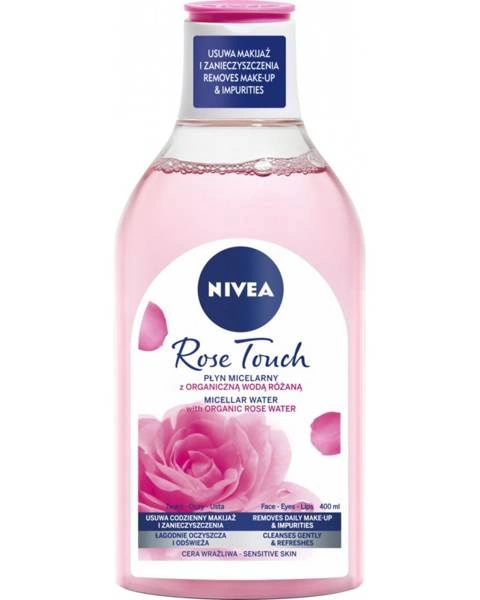 Nivea Visage płyn micelarny Rose Touch posiada działanie dwufazowe. Bardzo delikatnie oczyszcza skórę, usuwa nawet wodoodporny makijaż jednocześnie kojąc skórę nadając jej odpowiednie nawodnienie.