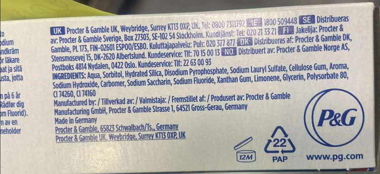 Aqua (Water), Sorbitol, Hydrated Silica, Disodium Pyrophosphate, Sodium Lauryl Sulfate, Cellulose Gum, Aroma, Sodium Hydroxide, Carbomer, Sodium Saccharin, Sodium Fluoride, Xanthan Gum, Limonene, Glycerin, Polysorbate 80, CI 74260, CI 74160