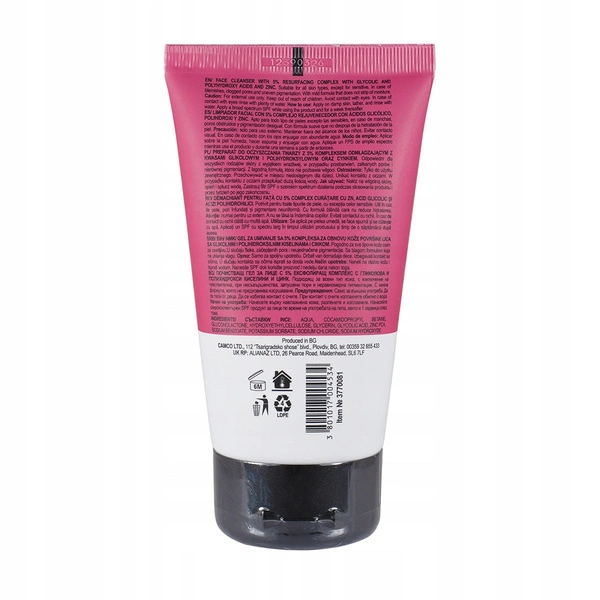 • Żel do oczyszczania skóry twarzy na bazie kwasów, oczyszcza, poprawia nawilżenie cery, zmniejsza zaczerwienia, wzmacnia naczynia krwionośne, wyrównuje koloryt. AHA (kwas glikolowy) - usuwa martwe komórki naskórka, poprawiając teksturę skóry.