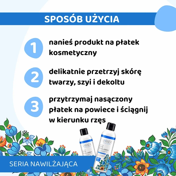 Nawilżający płyn micelarny Vianek przeznaczony jest szczególnie dla osób posiadających cerę suchą i wrażliwą. Trzeba nałożyć niewielką ilość płynu na płatek kosmetyczny i przetrzeć nim skórę twarzy. Pozostawi po sobie uczucie ukojenia.