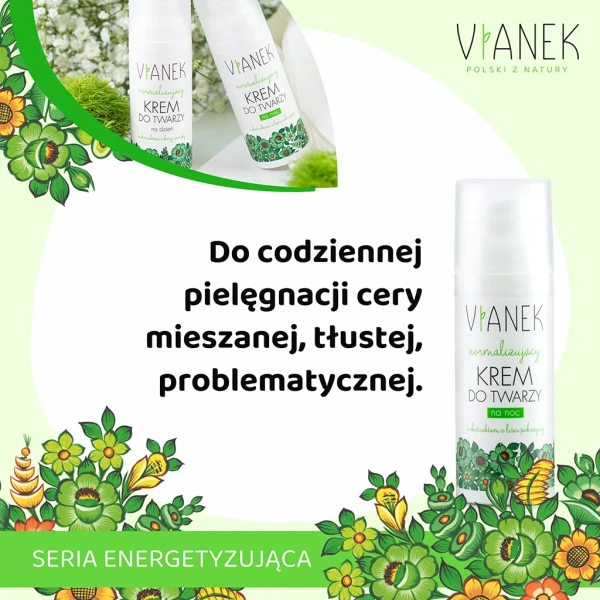 Normalizujący krem do twarzy noc Vianek przeznaczony dla cery tłustej z problemami. Stosować na oczyszczoną skórę twarzy, szyi i dekoltu. Krem doskonale sprawdzi się przy leczeniu trądziku.