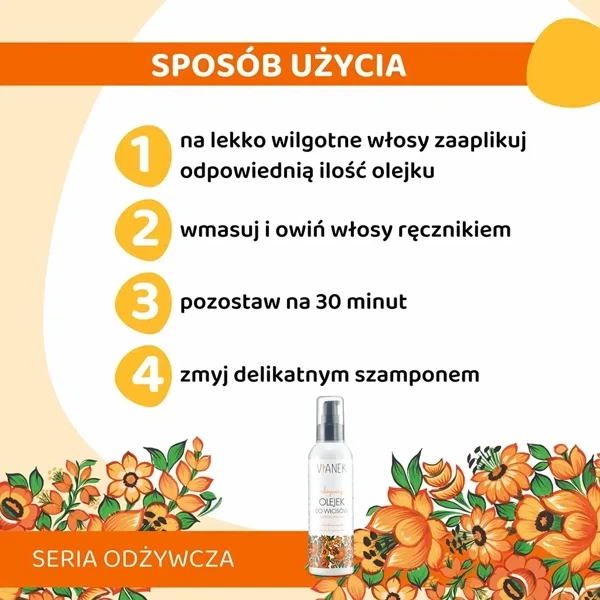 Odpowiednią ilość olejku nałóż na lekko wilgotne włosy, a następnie masuj i owiń ręcznikiem. Odczekaj 30 minut, a następnie zmyj delikatnym szamponem. Jako serum regenerujące wetrzyj niewielką ilość olejku w końcówki włosów..