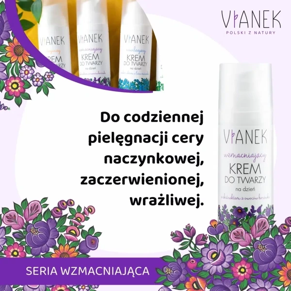 Wzmacniający krem do twarzy na dzień Vianek sprawdzi się osobom z cerą naczynkową. Krem nanieść na oczyszczoną skórę twarzy. Systematyczne stosowanie zdecydowanie poprawi kondycje Twojej skóry!
